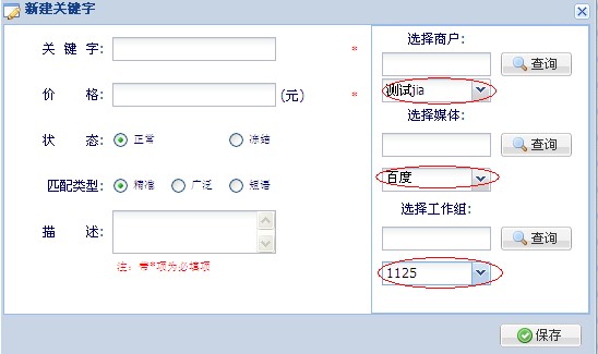 新建关键字时添加“关键字”,选择好要绑定的商户,媒体,工作组。